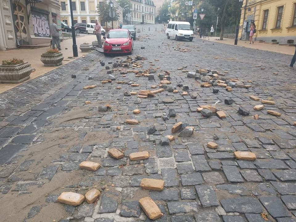 Стихия повалила деревья и столбы, некоторые из которых повредили припаркованные авто. На улицах ночью лежал слой льда из-за града, а утром, вода схлынула, унося брусчатку, и асфальт укрыл слой грязи.
