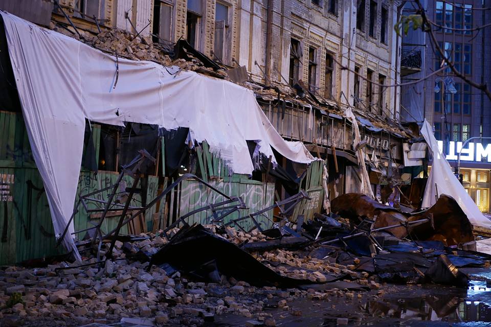 После ливня на Крещатике обвалилось здание старого гастронома, которое ранее едва уцелело при пожаре.