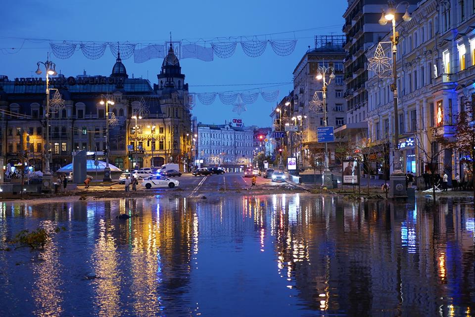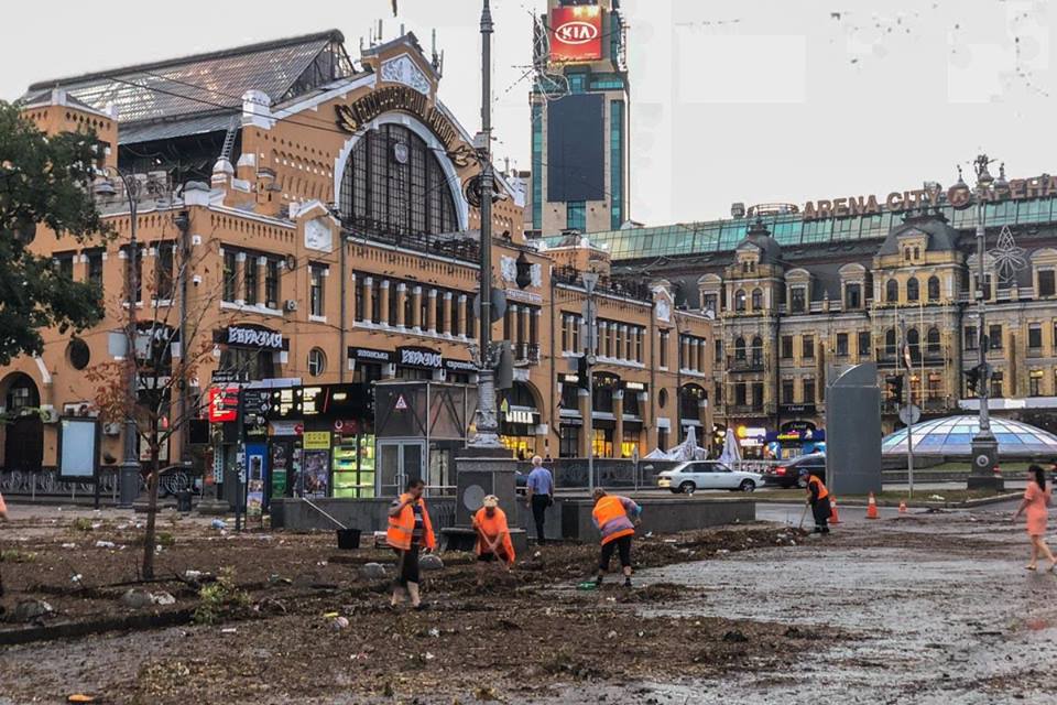 Крещатик на время ливня превратился в бурлящую реку. Когда вода схлынула, на дороге остались горы мусора, которые с утра принялись убирать коммунальщики.  Они достают листья и ветки из ливневок. У многих деревьев сломаны ветки.
