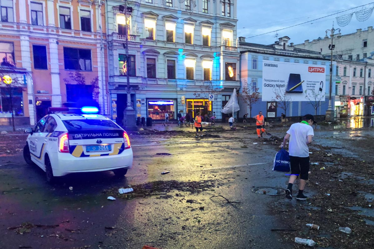 Оказались разбитыми рекламные щиты и вывески. были повалены деревья. Ночью вода затопила всю проезжую часть. Утром, после того, как потоки схлынули, оказалось, что Крещатик завален горой мусора и грязи. Сломанные ветки и мусор коммунальщики вручную достают из ливневок и устраняют последствия ночной грозы.