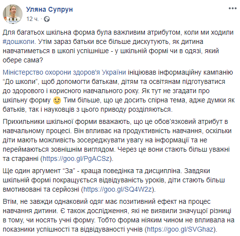 "Сейчас родители все больше дискутируют, как ребенок будет учиться в школе успешнее - в школьной форме или в одежде, которую выберет сам. Это довольно спорная тема, ведь мнения как родителей, так и ученых по этому поводу разделяются. Сторонники школьной формы считают, что это обязательный атрибут в учебном процессе. Он влияет на производительность обучения, так как дети имеют возможность концентрировать внимание на информации и не заморачиваются внешним видом. Как следствие, они становятся более внимательны и старательны. Еще один аргумент "за" - лучшее поведение и дисциплина. Благодаря школьной форме улучшается посещаемость уроков, дети становятся более мотивированными и серьезными", - написала Супрун.