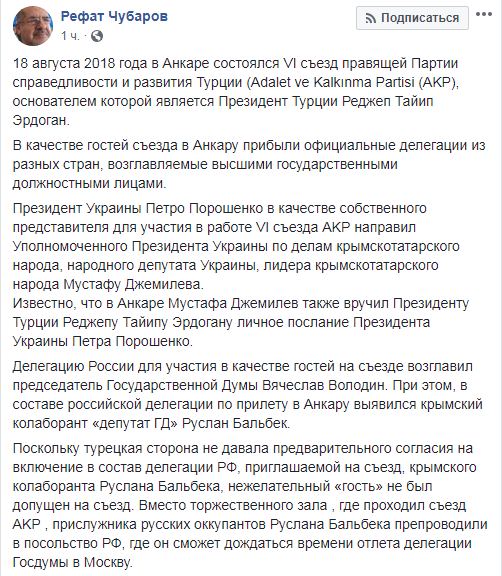 18 августа в Анкаре состоялся VI съезд правящей Партии справедливости и развития Турции (Adalet ve Kalkınma Partisi). В мероприятии приняли участие официальные делегации из разных стран. Представлять Украину на съезде Петр Порошенко направил лидера крымскотатарского народа Мустафу Джемилева. Через него же президент Украины передал Реджепу Тайипу Эрдогану личное послание.