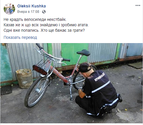 В Киеве угонщикам не удалось похитить велосипед Nextbike. Об этом сообщил руководитель компании Алексей Кушка на своей странице в Facebook.