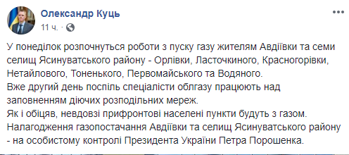 Глава Донецкой областной военно-гражданской администрации Александр Куць сообщил, когда в прифронтовой Авдеевке подключат газоснабжение. Об этом чиновник написал в Facebook.