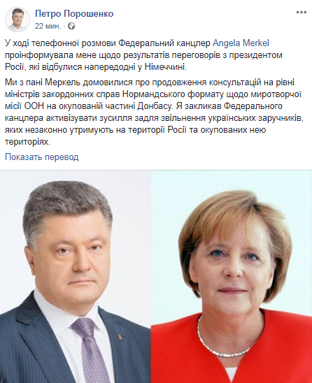 Канцлер ФРГ Ангела Меркель проинформировала президента Украины Петра Порошенко о результатах переговоров с главой России Владимиром Путиным. Это произошло в ходе телефонного разговора Меркель и Порошенко, сообщается на странице президента Украины в соцсети.