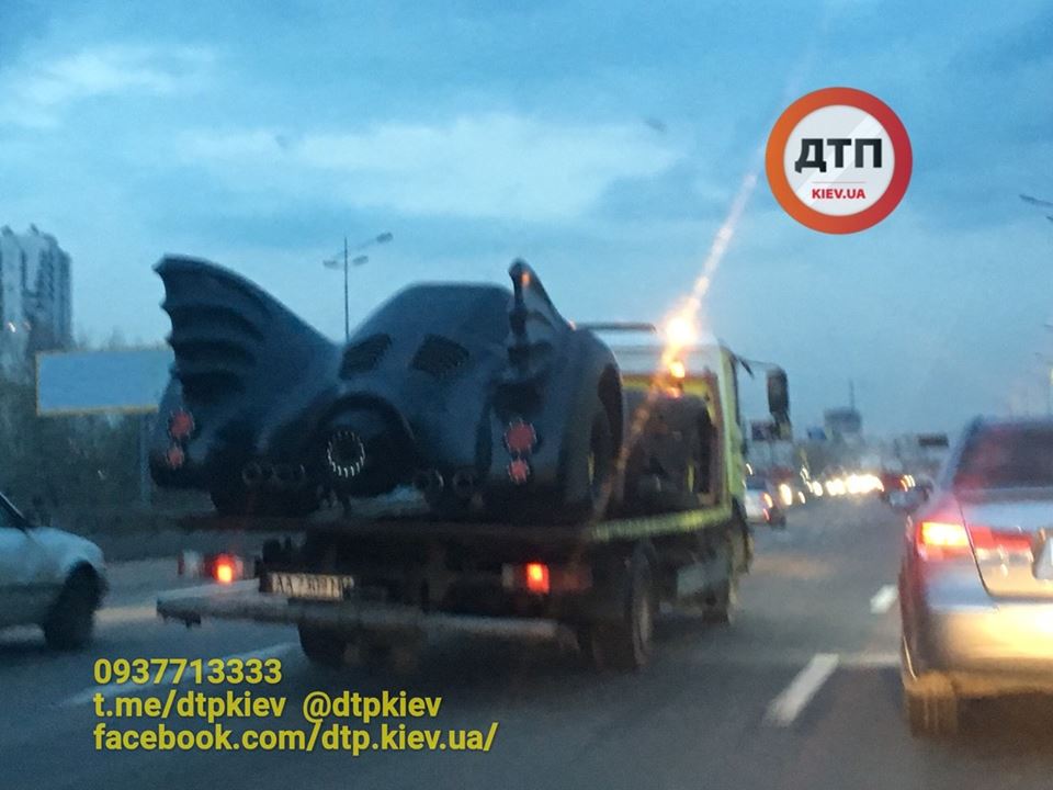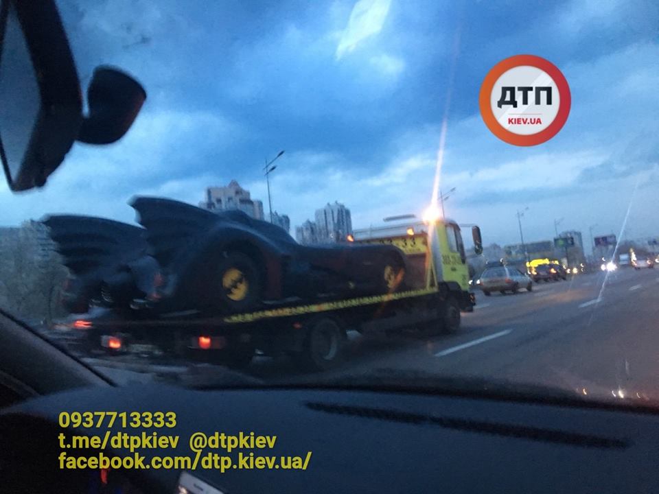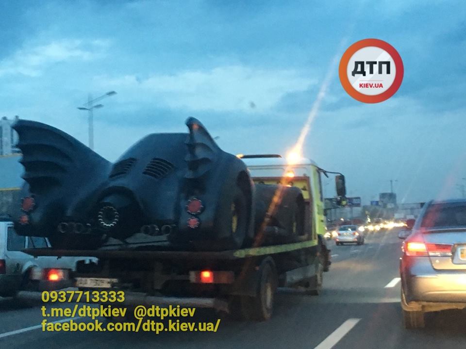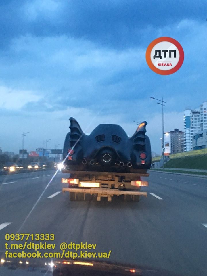 В Киеве заметили "Бэтмобиль" - машину героя американских кинофильмов и комиксов Бэтмена. Авто на платформе погрузчика сфотографировали на проспекте Бажана.