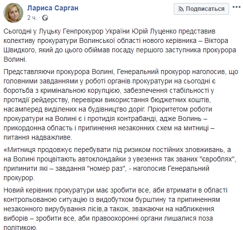 Генпрокурор Юрий Луценко представил коллективу прокуратуры Волынской области нового руководителя - Виктора Швыдкого. Приоритетом работы прокуратуры приграничной Волыни глава ГПУ назвал противодействие контрабанде и прекращение незаконных схем на таможне, в т.ч. ввозу "евроблях".