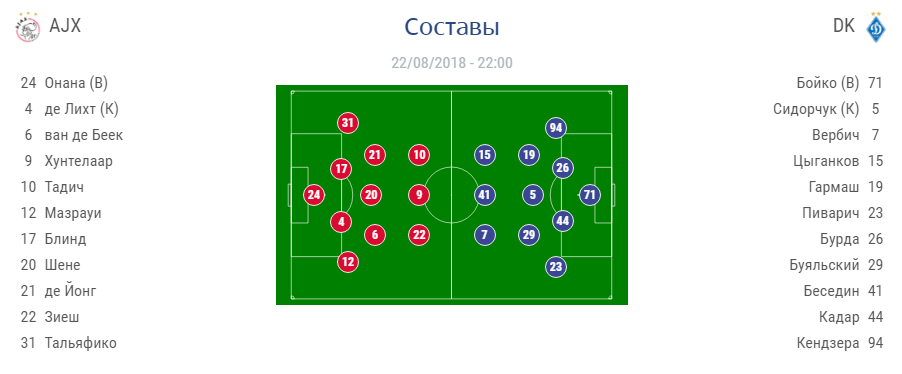 21:00 Игроки "Динамо" выйдут на поле в комплекте выездной формы синего цвета, голкипер - в зеленой. На youtube-канале украинских футболистов появилось видео с тренировки перед матчем. Перед игрой главный тренер "Динамо" Александр Хацкевич отметил, что "Аякс" исповедует атакующий футбол, а у "динамовцев" - силовая игра. По его словам. сегодня состоится столкновение двух игровых философий.