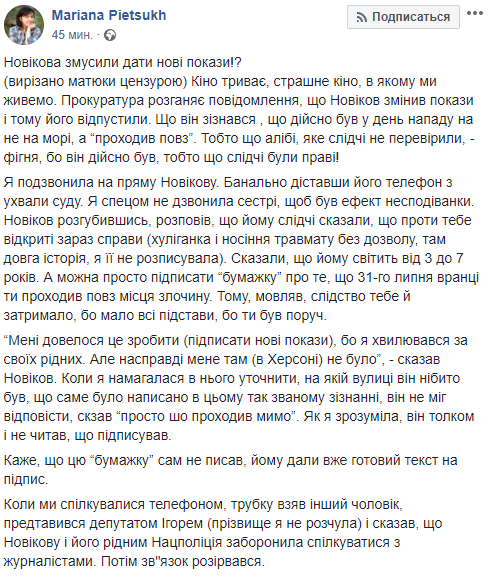 Также журналистка сообщила, что в момент общения с Новиковым телефонную трубку взял другой человек, который представился депутатом Игорем, и сказал, что Новикову и его родным Нацполиция запретила общаться с журналистами. Затем "связь" разорвалась.