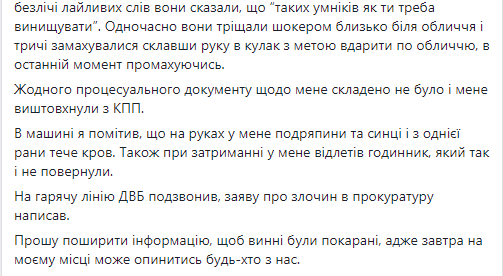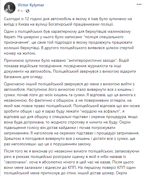 "Сегодня в 12:00 дня автомобиль в котором я ехал был остановлен на выезде из Киева на улице Богатырской работниками полиции. Один из полицейских был в характерном для беркутовцев малиновом берете. На шевроне у него было написано "полиция специального назначения", это именно то подразделение в котором продолжают работать бывшие беркутовцы. У другого полицейского оказался стерт номер жетона. Причиной остановки был назван "антитеррористические меры". Водитель показал водительское удостоверение, удостоверение журналиста и другие документы на автомобиль. Полицейский обратился с требованием открыть багажник для осмотра. Одновременно другой полицейский обратился ко мне с требованием выйти из автомобиля. Следующей его требованием стало вывернуть все из карманов и сумки, он начал лезть в мои карманы и сумки", - написал Килимар.