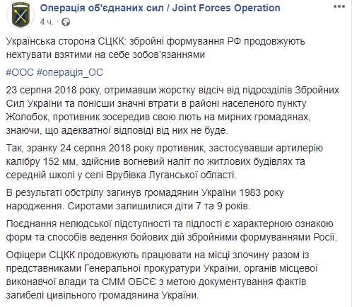 В пятницу, 24 августа, в зоне проведения операции Объединенных сил на Донбассе было зафиксировано 8 обстрелов со стороны сепаратистов, потерь в течение текущей суток не было. Об этом сообщает пресс-служба штаба ООС на своей странице в Facebook.