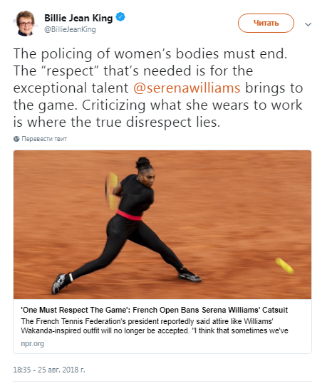 Знаменитая американская теннисистка 60-80-х годов и борец за равноправие в спорте Билли Джин Кинг также отметила, что стоит уважать Серену Уильямс - за то, как она играет, а не в чем она одета.