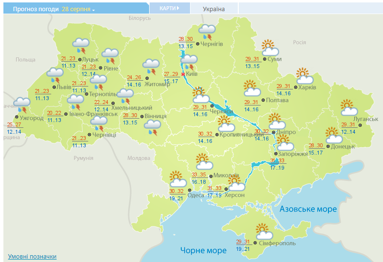 В западных и Житомирской областях ожидаются местами кратковременные дожди, грозы, на остальной территории сохранится сухая погода. Ветер юго-восточный, в западной части северо-западный, 5-10 м/с. Температура ночью 11-16°, в южной части 17-22°; днем 27-32°, в западных областях 19-24°. На западе Украины дождь с грозой. Температура воздуха ночью +13 +15 градусов, днем +21 +24 градусов.