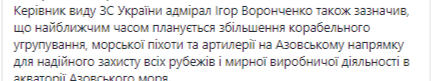В настоящее время проведено перебазирование подразделений морской авиации на полевой аэродром. По словам Воронченко, в ближайшее время планируется увеличить корабельную группировку, морской пехоты и артиллерии на азовском направлении для "надежной защиты всех рубежей и мирной производственной деятельности в акватории Азовского моря". Других подробностей в ведомстве не сообщили.