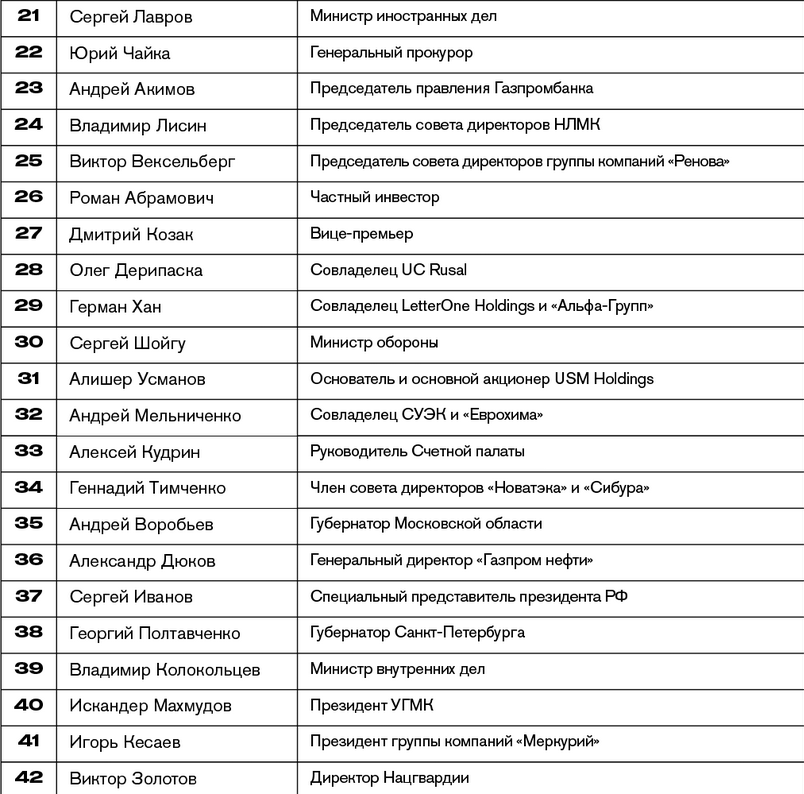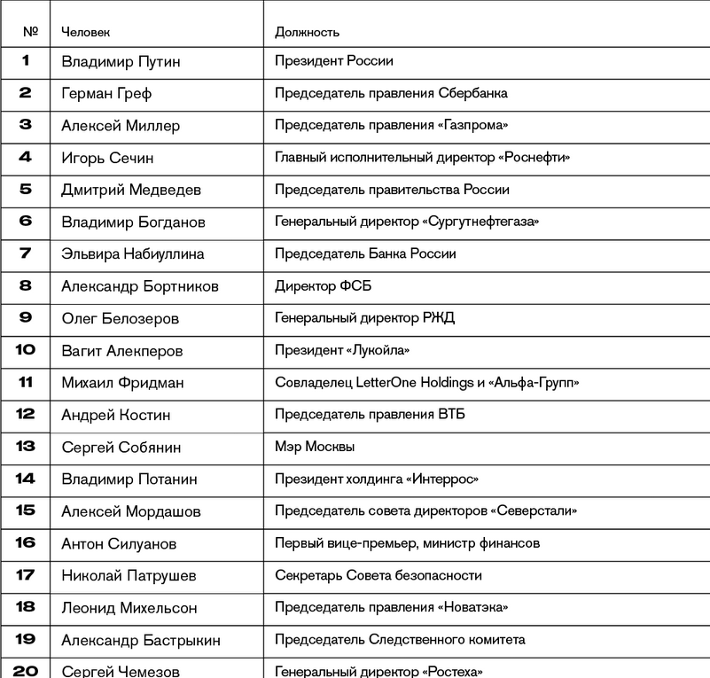 В Топ-10 вошли гендиректор "Сургутнефтегаза" Владимир Богданов, глава Центробанка Эльвира Набиуллина, директор ФСБ Александр Бортников, генеральный директор РЖД Олег Белозеров и президент "Лукойла" Вагит Алекперов.