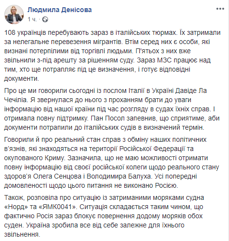 В тюрьмах Италии находится 108 украинцев, задержанных за нелегальную перевозку мигрантов, но есть и несколько потерпевших от торговли людьми, и сейчас МИД Украины работает над их освобождением. Об этом сообщила уполномоченный Верховной Рады по правам человека Людмила Денисова на своей странице в Facebook.