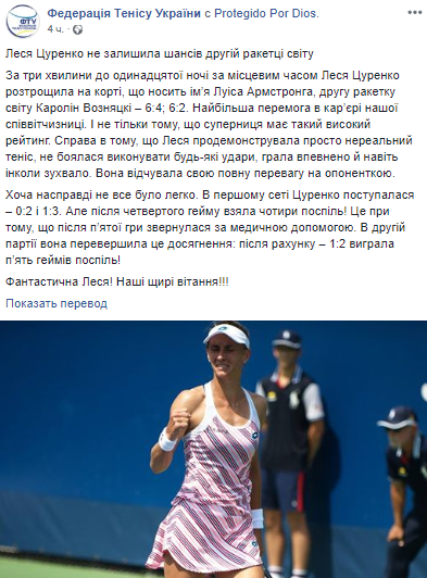 "Цуренко разгромила на корте, носящем имя Луиса Армстронга, вторую ракетку мира Каролин Возняцки - 6:4; 6:2. Самая крупная победа в карьере нашей соотечественницы. И не только потому, что соперница имеет такой высокий рейтинг. Дело в том, что Леся продемонстрировала просто нереальный теннис, не боялась выполнять любые удары, играла уверенно и даже иногда вызывающе. Она чувствовала свое полное превосходство на оппоненткой", - рассказали в Федерации.