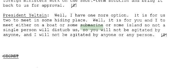 Так, например, из обнародованной стенограммы телефонного разговора Елцина и Клинтона во время кризиса, вызванного бомбежками Югославии самолетами НАТО в 1999 году, президент России предлагал коллеге провести тайные переговоры. Среди предложенных "уединенных" мест для встречи президентом фигурировала подводная лодка.