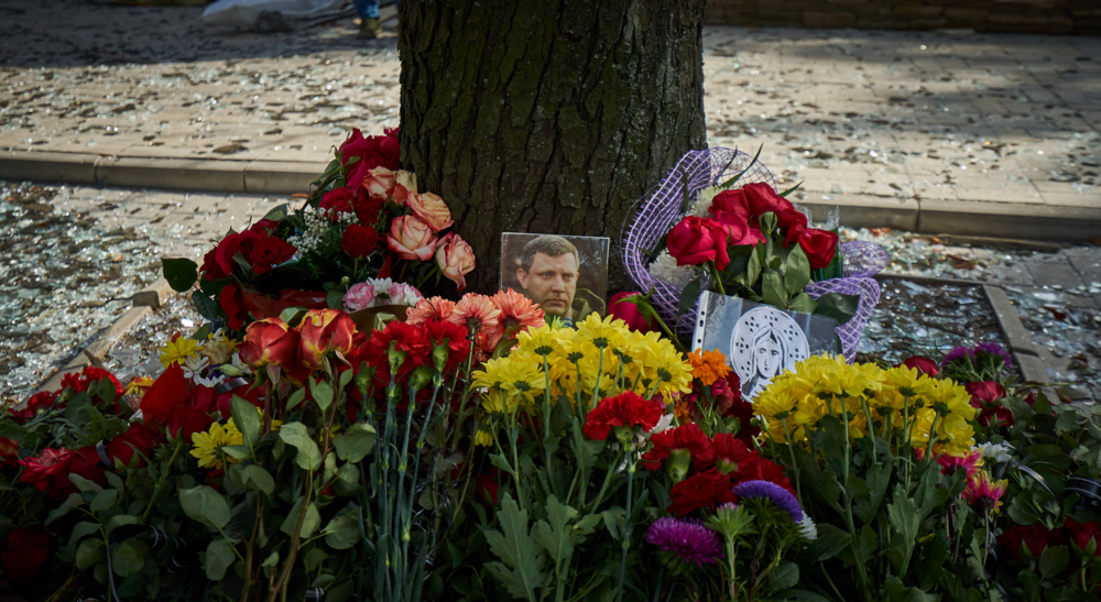 В распоряжении "Страны" оказались фото с места ликвидации Александра Захарченко. Они были сделаны сегодня, 1 сентября. Под деревом у кафе, стоит портрет Захарченко, икона Богоматери и много красных и желтых цветов.