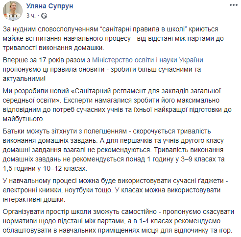 По словам Супрун, разработан новый "Санитарный регламент для учреждений общего среднего образования". В школах сокращается длительность выполнения домашних заданий: не более одного часа в 3-9 классах и 1,5 часа в 10-12 классах. А для первоклассников и учеников второго класса домашние задания вообще не рекомендуются.