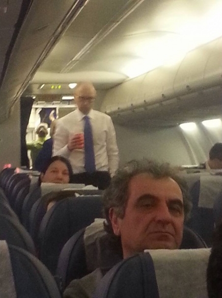 Яценюк повторил перелет в экономе в марте 2015 года в компании Михаила Саакашвили. Политики летели через Варшаву в Брюссель. Фотографии выложил пользователь Zenia Klimakin.