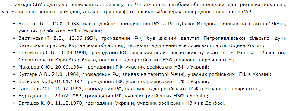 По данным СБУ, в числе погибших есть иностранные граждане, опубликованы также групповые фото "Вагнера" накануне уничтожения в Сирии. В списке указаны фамилии 8 граждан России, а также одного украинца. Все они, по данным СБУ, принимали участие в боевых действиях на востоке Украины в составе незаконных вооруженных формирований (НВФ).