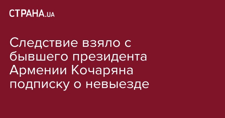 Специальная следственная служба (ССС) Армении избрала в отношении бывшего президента страны Роберта Кочаряна меру пресечения в качестве подписки о невыезде. Об этом во вторник сообщила корреспонденту ТАСС пресс-секретарь ведомства Марина Оганджанян.