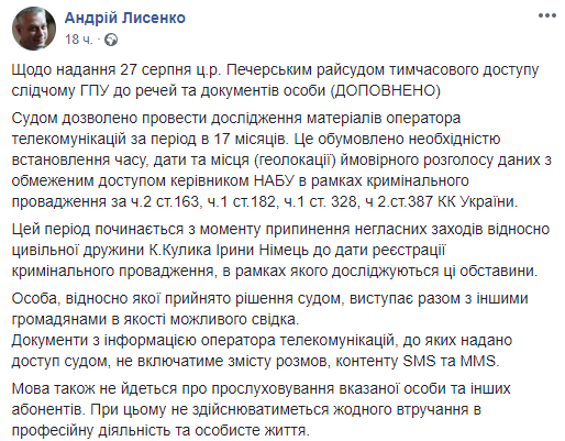 После того, как разгорелся скандал, спикер Генпрокуратуры Андрей Лысенко пояснил, что получение данных от мобильного оператора за 17 месяцев - это не вмешательство в профессиональную или личную жизнь. Кроме того, по его словам, в ГПУ не будут изучать содержание смс, а журналистку не поставят на прослушку. А все, что нужно Генпрокуратуре - данные о геолокации.