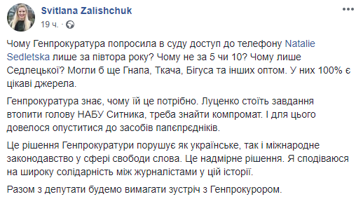 "Имею просьбу к журналисту "Радио "Свобода"" Natalie Sedletska, которая, как мы теперь знаем, неофициально встречается с директором Национального антикоррупционного бюро Артемом Сытником и обсуждает с ним информацию об интимной жизни посторонних лиц, полученную НАБУ путем незаконного прослушивания телефонов (в частности - путем прослушивания телефона гражданки Ирины Немец). Поскольку я не принадлежу к числу тех людей, которые могут задать вопрос Сытнику, то - как журналист, ранее также работал на Радио "Свобода" - прошу Наталью во время следующей встречи спросить у Артема Сергеевича, на основании чего Национальное антикоррупционное бюро Украины в сентябре-