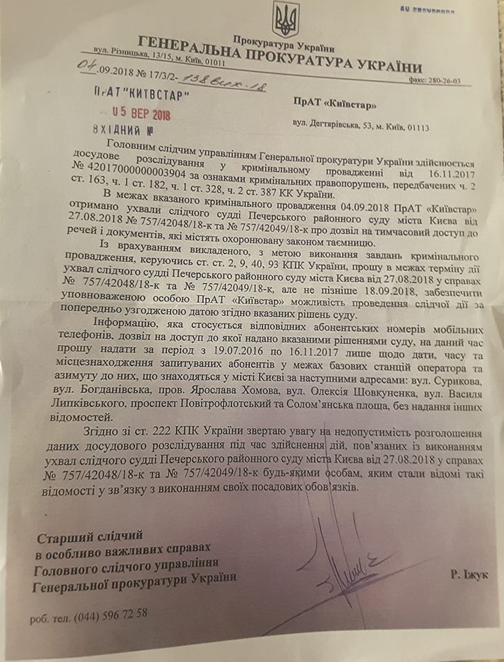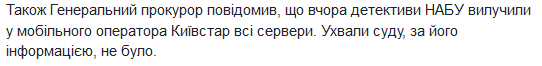 Также Генеральный прокурор сообщил, что вчера детективы НАБУ изъяли у мобильного оператора Киевстар все серверы. Постановления суда, по его информации, не было", - написала Червакова.