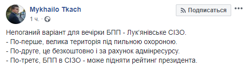 "Неплохой вариант для вечеринки БПП - Лукьяновское СИЗО. Во-первых, большая территория бдительной охраной. Во-вторых, это бесплатно и за счет админресурса. В-третьих, МЧП в СИЗО - может поднять рейтинг президента", - написал он.