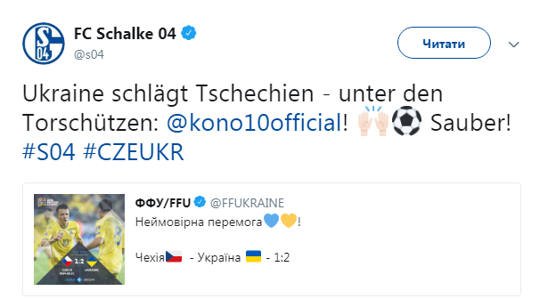Клубы, в которых играют украинцы, отметили голы своих игроков в социальной сети Тwitter. Шальке отметил: "Украина победила Чехию. Один из бомбардиров - Евгений Коноплянка".