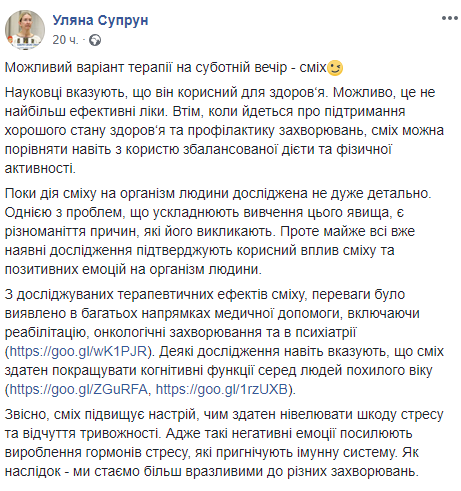 Глава Минздрава Ульяна Супрун, которая возглавила рейтинг ненавистных украинцам политиков, сообщила о пользе смеха для здоровья, который можно сравнить даже с пользой сбалансированной диеты и физической активности. Об этом она сообщила на своей странице в Facebook.