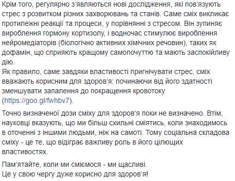 "Как правило, именно благодаря свойству подавлять стресс, смех считают полезным для здоровья: начиная от его способности уменьшать воспаление к улучшению кровотока", - подытожила Супрун.