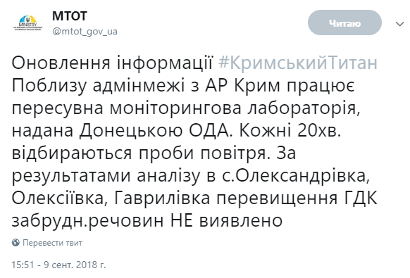 "Поблизости админграницы с АР Крым работает передвижная мониторинговая лаборатория, предоставленная Донецкой ОГА. Каждые 20 минут отбираются пробы воздуха", - говорится в сообщении.