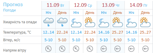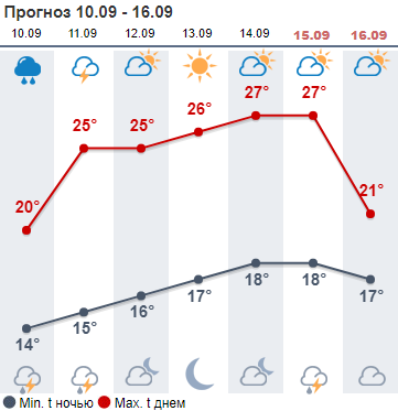 Ресурс Мeteoprog.ua прогнозирует дождь 10 и 11 сентября и температуру до +20. Затем установится сухая погода, потеплеет до +26...+27. Однако с воскресенья температура снизится до +21.