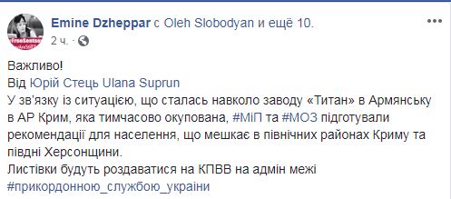 "Листовки будут раздаваться на КПВВ на админграницах", – написала она.