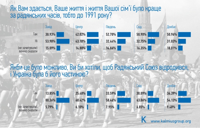По данным социологического опроса, проведенного "Кальмиусская группой" в партнерстве с компанией GfK Ukraine, 43% населения в целом и 51% жителей Донбасса считают, что их жизнь или жизнь их семей в советские времена была лучше. С таким утверждением не согласны 42% и 31% соответственно.