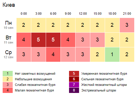 По данным Gismeteo, ее пик в Киеве придется на период с 03:00 до 06:00. Геомагнитные возмущения стихнут к 18:00. 12 сентября признаки малой геомагнитной бури могут ощущаться в 06:00 и практически прекратятся к 15:00.