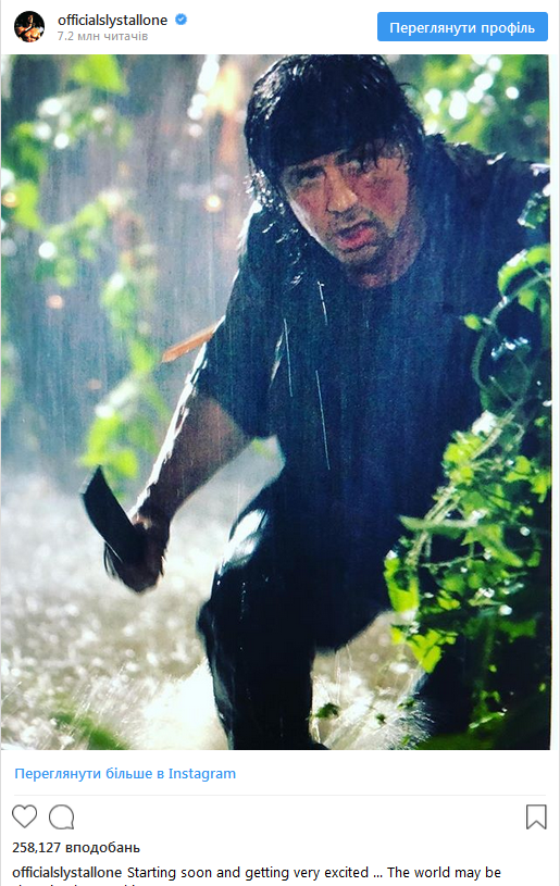 "Приступаю скоро и очень взволнован. Мир, возможно, меняется, но не он", - написал актер, разместив снимок своего персонажа из картины "Рэмбо IV" (Rambo, 2007). "Ничто не закончено!" - дописал он, позаимствовав одно из коронных выражений своего героя.