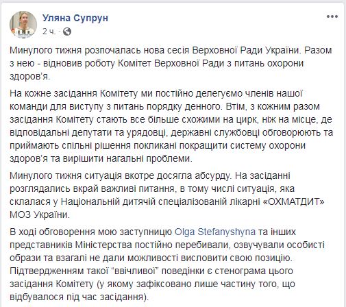 "В ходе обсуждения мою заместительницу Ольгу Стефанишину и других представителей Министерства постоянно перебивали, озвучивали личные обиды и вообще не дали возможности высказать свою позицию" - сообщила Супрун.