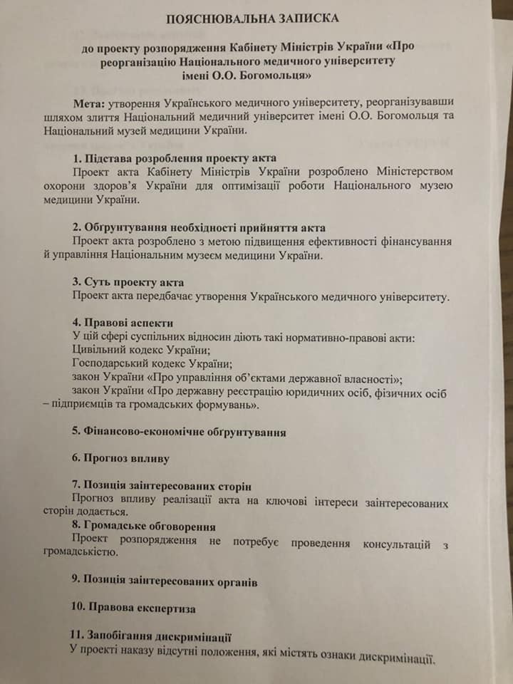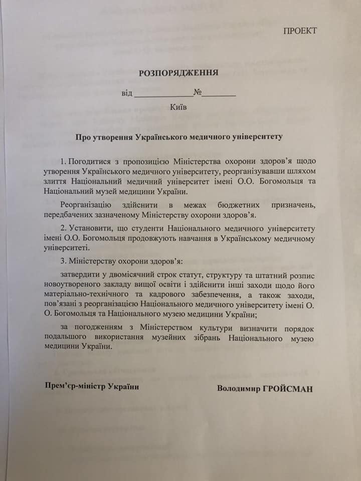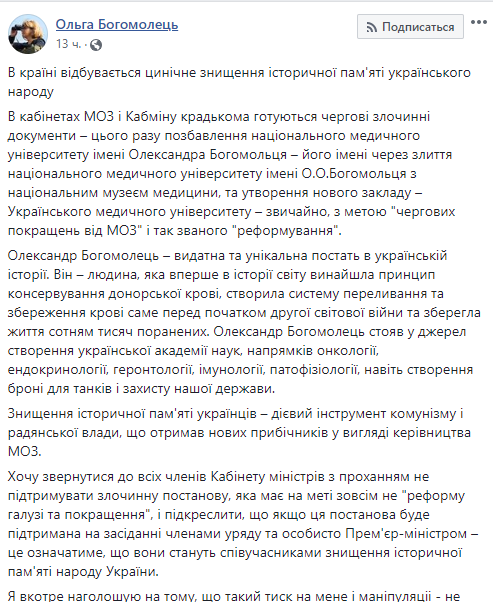 Народный депутат Ольга Богомолец на своей странице в Fаcebook написала, что Минздрав и Кабмин хотят лишить национальный медицинский университет имени Александра Богомольца его имени из-за слияния с национальным музеем медицины. Таким образом будет образован Украинский медицинский университет, который уже не сможет носить имя Богомольца.