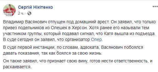 "Васяновича отпустили под домашний арест. Он заявил, что только привез подельников из Олешек в Херсон. Хотя ранее его называли тем участником группы, который подавал сигнал, что Катя вышла из подъезда", - написал Никитенко. Также журналист сообщил, что мужчина в суде заявил, что нападение организовал "Опер" Сергей Торбин.