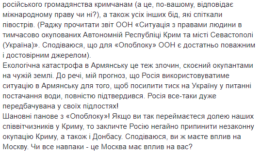 "Государственный чиновник, открыто призывающий нарушить нормы международного права, и обязывающий ограничить крымчан в доступе к воде, должен быть отправлен в отставку и осуждён за геноцид.