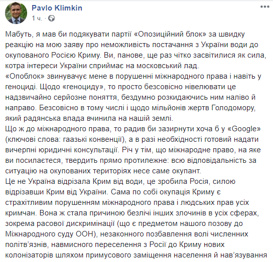 Глава МИД Павел Климкин должен понести ответственность за свои слова, что Крым нужно отставить без воды. Такое заявление сделал Оппозиционный блок, опубликовав его текст на своейм сайте.