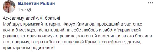 По его данным, Камалов, который провел в застенках почти 8 месяцев, вчера, 13 сентября, отбыл к семье в Крым.
