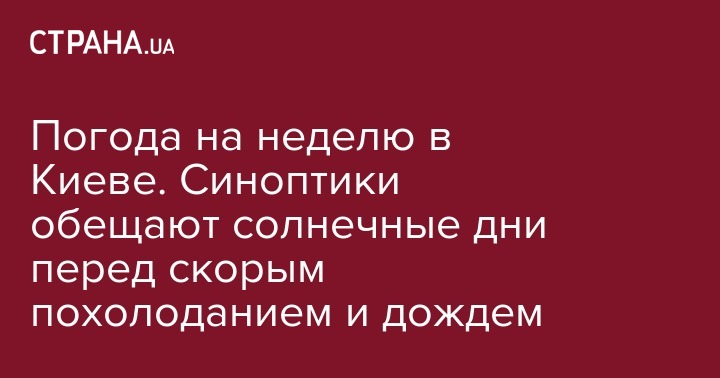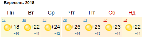 Ресурс Мeteoprog.ua также обещает солнечную неделю в столице к выходным постепенно воздух разогреется до +26, а в воскресенье, 23 сентября, похолодает до +17.