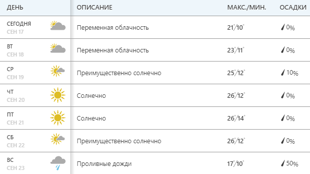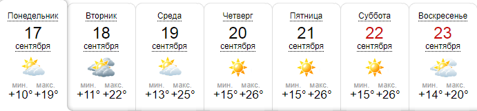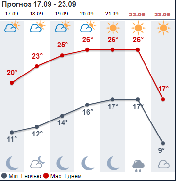 Сайт Gismeteо обещает солнечную неделю. В начале недели термометры покажут +18...+20 днем, затем до +24...+26. В воскресенье температура снизится до +22. С 24 сентября этот сайт обещает дожди и снижение температуры.