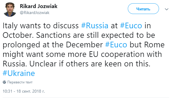Италия планирует поднять вопрос смягчения антироссийских санкций на заседании Европейского совета в октябре. Об этом во вторник, 18 сентября, сообщил корреспондент Радио Свобода Рикард Йозвяк на своей странице в Twitter.