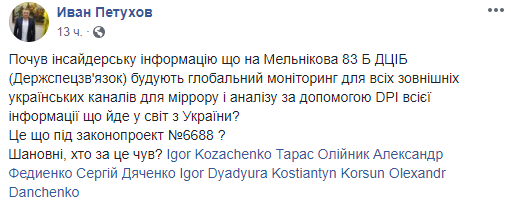 "Услышал инсайдерскую информацию что на Мельникова 83 Б (Госспецсвязь) строят глобальный мониторинг для всех внешних украинских каналов для миррор и анализа с помощью DPI всей информации идущей в мир из Украины? Это что под законопроект №6688 (о внесудебной блокировке сайтов - ред.)?" - написал Петухов в Facebook.